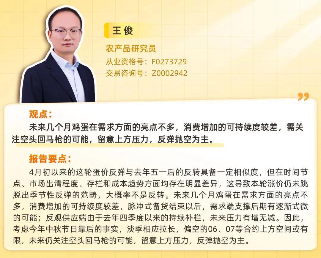 综上,4月初以来的这轮蛋价反弹与去年五一后的反转具备一定相似度,但在时间节点、市场出清程度、存栏和成本趋势方面均存在明显差异,这导致本轮涨价仍未跳脱出季节性反弹的范畴,大概率不是反转。未来几个月鸡蛋在需求方面的亮点不多,消费增加的可持续度较差,脉冲式备货结束以后,需求端支撑后期有逐渐式微的可能;反观供应端由于去年四季度以来的持续补栏,未来压力有增无减。因此,考虑今年中秋节日靠后的事实,淡季相应拉长,偏空的06、07等合约上方空间或有限,未来仍关注空头回马枪的可能,留意上方压力,反弹抛空为主。