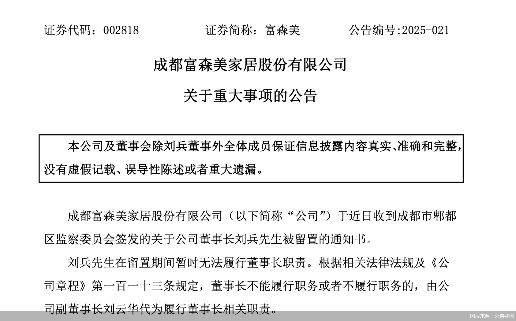 7月30日,成都富森美(002818)家居股份有限公司(以下简称“富森美”)资本市场在经历了连续两日下滑后,今日以12.12元/股收盘,涨幅1.08%。此前资本市场下滑的背后,或与实控人被留置有关。富森美发布的《关于重大事项的公告》显示,公司董事长刘兵被留置,在留置期间暂时无法履行董事长职责。值得注意的是,在高管风波背后,富森美正面临业绩持续下滑的挑战。2025年一季度,富森美营收、净利润同比下滑分别为13.19%、21.06%。值得注意的是,从2023年四季度开始,富森美营收连续6个季度同比出现下滑。与业绩持续下滑形成鲜明对比的,是富森美的高额分红。2024年富森美豪掷8.08亿元现金分红,分红比例高达117.11%,超过全年净利润。