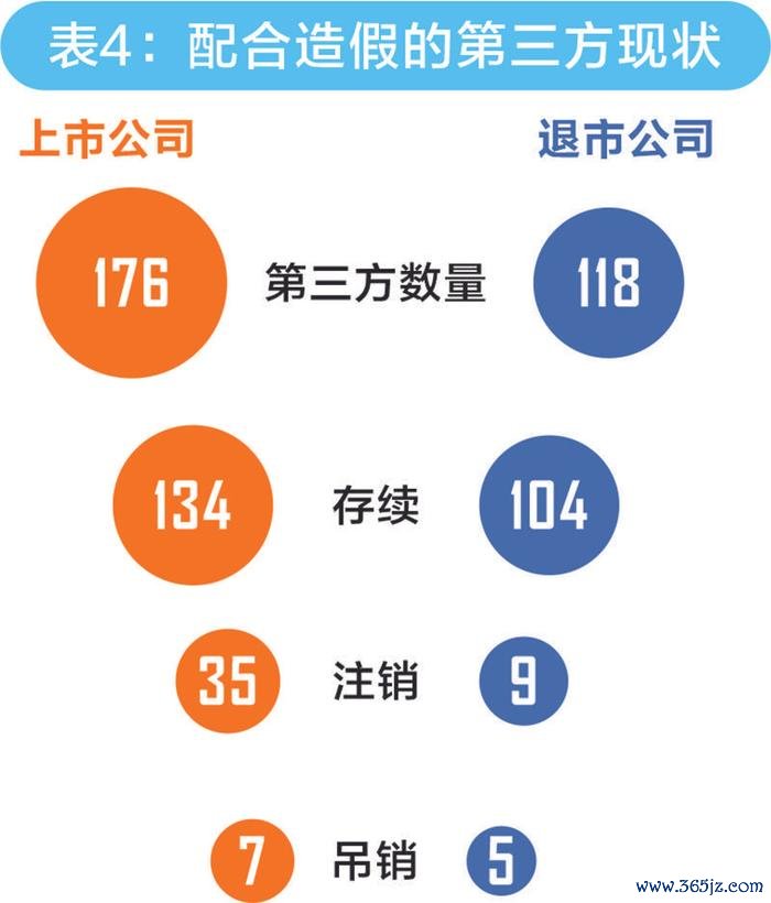 据统计,近五年来,证监会行政处罚决定书或事先告知书中明确提及配合造假第三方公司名称的有294家,这些卷入造假案的第三方公司近两成目前处于注销或吊销状态(表4)。