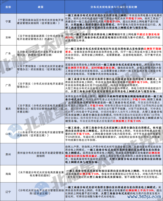值得关注的是,政策层面还进一步要求,430后并网的分布式项目需按各省细则执行。目前,已有宁夏、吉林、广东、江苏等10省份发布相关细则。从各省公布的政策来看,除广东、江苏、贵州因消纳能力强,对工商业项目自发自用比例暂不设限外,其余省份普遍要求30%~80%的自用消纳比例。