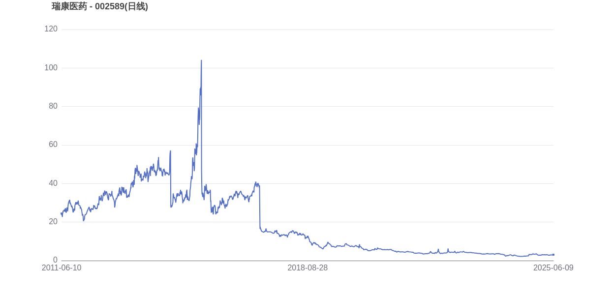 从上市首日至今,瑞康医药的市值实现了1.00倍的增长。2015年5月20日,瑞康医药的市值巅峰达到308.05亿元,股价也顺应升至111.1元。而至6月9日收盘,瑞康医药的股价为3.05元,市值为45.89亿元,相比峰值时期市值减少262.16亿元,市值蒸发了85.10%。